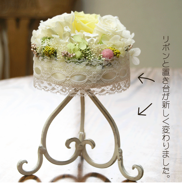材 料プリザーブドフラワー(バラ)・ライスフラワー・スタンド(鉄製)・リボン・ペーパー サイズ約横150mm×奥行き150mm×高さ210mm 特 徴お花は、特殊加工をしたプリザーブドフラワーなので、いつまでも枯れることなく飾っておくことができます。 注意※自然素材のため、写真と異なりますのでご了承ください。多少花材がかわる場合もあります。 ※花台はかわる場合もございます。 ※アンティーク加工の花...